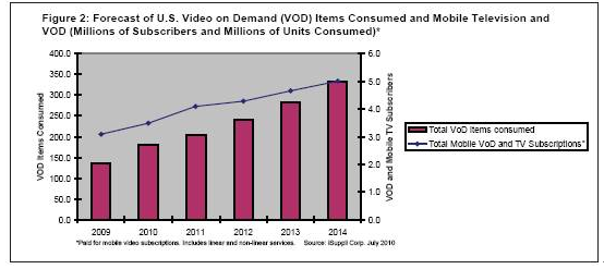 2010年美國移動(dòng)視頻點(diǎn)播(VOD)和移動(dòng)電視活躍用戶預(yù)計(jì)增長到350萬個(gè),2009年是310萬個(gè)。隨后幾年用戶數(shù)量預(yù)計(jì)繼續(xù)增長,到2014年達(dá)到500萬個(gè)。