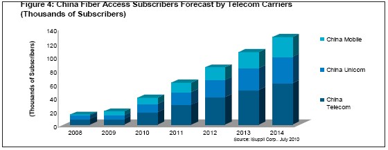 圖4所示國iSuppli公司對于2008-2014年各家運營商的光纖接入用戶數(shù)量預測。