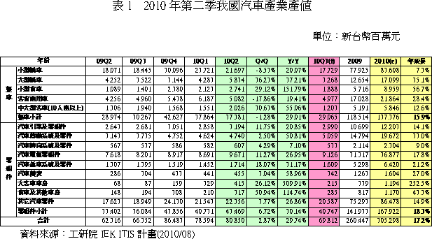 2010年第二季汽車產(chǎn)業(yè)總產(chǎn)值預(yù)估為新臺幣808.5億元,較上一季成長2.87%,較2009年同期成長29.74%(表1)。