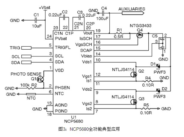 要在弱光下拍得高分辨率照片的數(shù)碼相機(jī)需要高亮度閃光。雖然白光LED能提供這個(gè)等級(jí)的光能,但需要比電池所提供的高出近400%的能量。以安森美半導(dǎo)體的NCP5680為例,它配合電池管理及超級(jí)電容來(lái)驅(qū)動(dòng)LED閃光至充分亮度,提供達(dá)10 A的大峰值電流。NCP5680的集成驅(qū)動(dòng)器還可管理超級(jí)電容,處理其他峰值功率功能,如變焦、自動(dòng)對(duì)焦、音頻、視頻、無(wú)線傳輸、GPS數(shù)據(jù)讀取及射頻(RF)放大,延長(zhǎng)電池使用時(shí)間又兼顧纖薄型設(shè)計(jì),節(jié)省開(kāi)發(fā)時(shí)間、電路板空間及元器件成本,見(jiàn)圖3。