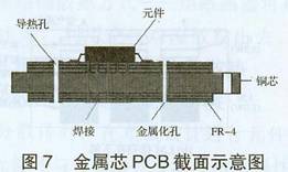 金屬板嵌入多層印制板的中間,其典型結(jié)構(gòu)如圖7金屬芯板本身也可作為地層使用,其上下層可通過金屬化孔(與芯板絕緣)互聯(lián),并通過導(dǎo)熱孔實現(xiàn)熱量在金屬芯板內(nèi)層和表面的傳遞。如圖7所示,發(fā)熱元件可通過底部和導(dǎo)熱孔直接焊接在板面上,發(fā)熱器件產(chǎn)生的熱直接傳遞到金屬芯板,由金屬芯板經(jīng)導(dǎo)熱孔傳給接觸的安裝機箱而散發(fā)出去;熱量較大時可銑去芯板兩邊的絕緣層,通過邊緣裸露的金屬芯板與機座接觸散熱,因此具有良好的散熱效果。對處于密閉機箱中的電路散熱是一種較好的選擇金屬芯PCB的芯材通常有鋁、銅、鋼等,后來開發(fā)出了覆銅因瓦復(fù)合材料(CIC),它不僅具有良好的導(dǎo)熱性,而且其熱膨脹系數(shù)與半導(dǎo)體器件匹配性好,所制成的CIC金屬芯板可應(yīng)用于要求高可靠性、高組裝密度、高功率、高性能的軍用電子設(shè)備中。