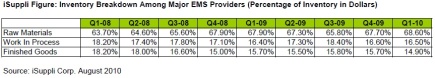 iSuppli指出,觀察全球前五大電子制造服務(wù)(EMS)的最新庫(kù)存狀況顯示,在2010年第一季,零組件與原材料占據(jù)近七成的總庫(kù)存量;相對(duì)來(lái)看,在制品(work-in-process goods)占據(jù)總庫(kù)存量的比例為17%,成品(finished goods)所占比例則低于15%。