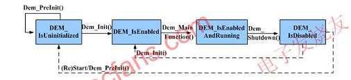 DCM模組遵循的標(biāo)準(zhǔn)與DCM相同,負(fù)責(zé)直接處理與DTC相關(guān)的服務(wù),如UDS中的0x19服務(wù)(響應(yīng)報(bào)文由DCM發(fā)送出去)。當(dāng)軟體構(gòu)件中的MonitorFunction檢測到故障或BSW模組檢測到故障時(shí),將通知DEM模組處理和儲(chǔ)存‘診斷事件’(由EventID進(jìn)行標(biāo)識(shí))。如果故障確診,唿叫NVRAMManager(非揮發(fā)性記憶體管理器)提供的介面將其存取到非揮發(fā)性記憶體中,同時(shí)通知應(yīng)用層進(jìn)行故障指示。DEM的狀態(tài)圖如圖3所示: