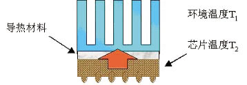 如圖1所示,目前比較常用的一種散熱方式是使用散熱器,用導(dǎo)熱材料和工具將散熱器安裝于芯片上面,從而將芯片產(chǎn)生的熱量迅速排除。本文介紹了根據(jù)散熱器規(guī)格、芯片功率、環(huán)境溫度等數(shù)據(jù),通過熱傳導(dǎo)計算來求得芯片工作溫度的方法。