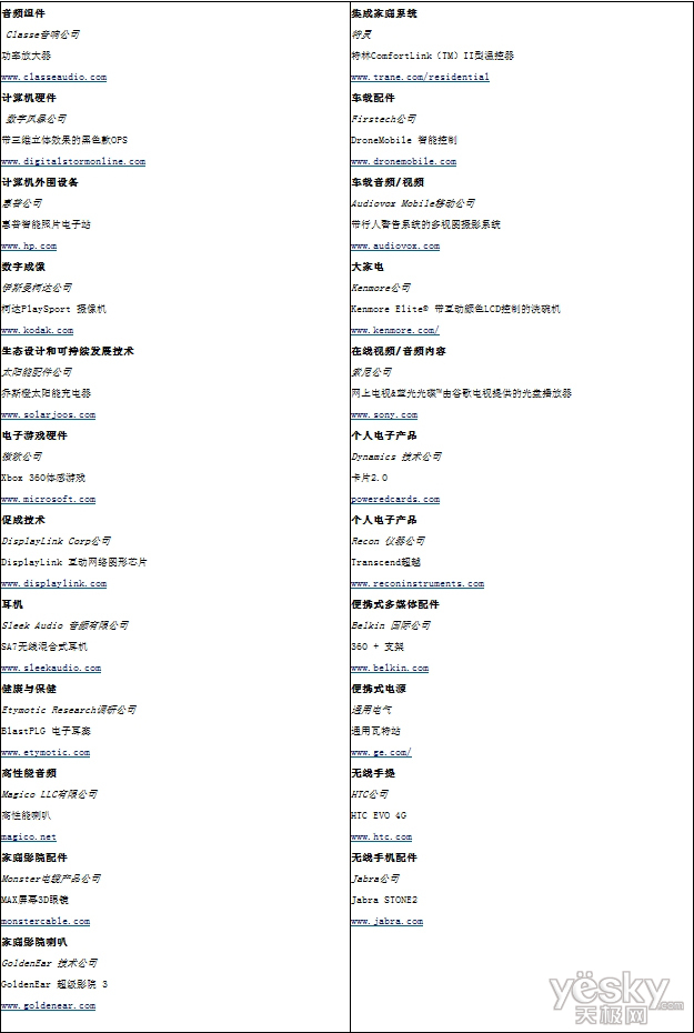 美國消費電子協會(CEA)今天宣布2011年國際消費電子展最佳創新設 計與工程獎獲獎名單。國際消費電子展創新獎旨在嘉獎從35個消費電子產品類別中出脫穎而的設計與工程杰出項目。“這些極具聲望的獎項計劃讓消費電子技術生產商和開發商的產品能夠擺在那些著名的設計者、工程師和媒體面前,接受他們的公開評選。”CEA主席 兼首席執行官加里﹒夏皮羅說。“今年提交的作品展示出了消費電子行業的活力和創新力。我們向所有獲獎者表示祝賀,他們的工程創意和 設計觸覺讓我們驚嘆不已。”