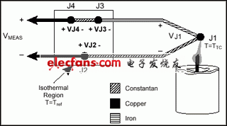 圖3中,J2和J4接點屬于同一類型(銅鎳合金);因為兩者處于等溫環境,J2和J4也是同樣的溫度。因為電路中電流方向緣故,J4端產生一個Seebeck正電壓,J2端產生一個Seebeck負電壓。因此,接點抵消了相互之間的影響,測量電壓的總量就為零。J1和J3接點都是鐵—銅鎳合金接點。但是他們的溫度可能不同,因為他們可能不是在等溫環境中。因為他們處于不同溫度環境下,J1和J3接點都可以產生Seebeck電壓,但是大小不同。為了補償冷端J3,測量其溫度并將其作用電壓從熱電偶測量中減去。