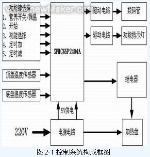 利用凌陽8位MCU設計的智能電飯煲控制系統原理框圖如圖2-1所示,通過按鍵來選擇功能模式、顯示電路完成顯示當前狀態和定時時間;通過溫度傳感器來對溫度進行采樣;通過MCU的控制終極實現對繼電器的控制,從而來控制對加熱盤的加熱與否,電源部分完成對單片機系統和外圍電路提供5V電源,并且對加熱盤進行加熱。