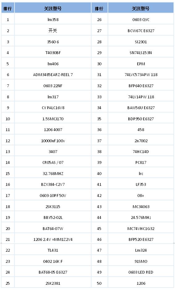 您知道在過去的一周,各商家都在關注哪些型號的IC產(chǎn)品嗎?哪些產(chǎn)品關注度最高呢?根據(jù)過去一周的情況,總結出商家最關注IC型號排行榜top50,這將有助于大家研究市場趨勢,排名如下: