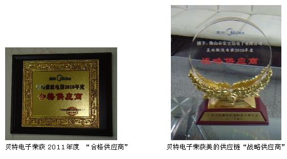 與美的合作近8年來,貝特電子有限公司憑借過硬的產品質量,極強的研發(fā)能力,優(yōu)質的售前售后服務,成功獲得“合格供應商”及“戰(zhàn)略供應商”兩項大獎,并得到獎金3萬元。