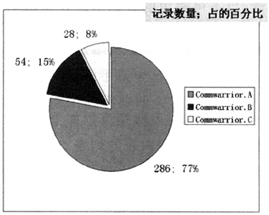 通過GPRS核心網抓包分析,目前用戶感染的彩信病毒類型主要是CommWarrior病毒,A,B,C分別是其的變種類型,具體感染的比例參見圖3。
