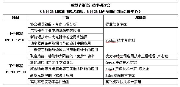 [page]新型節(jié)能設(shè)計(jì)技術(shù)研討會(huì)以風(fēng)能太陽(yáng)能發(fā)電與節(jié)能設(shè)計(jì)為主題,圍繞智能電源、逆變器設(shè)計(jì)、智能控制、馬達(dá)控制、新型電子元器件與模塊的應(yīng)用展開(kāi)探討,來(lái)自知名廠商的技術(shù)專(zhuān)家將分享逆變器設(shè)計(jì)、馬達(dá)控制、變頻技術(shù)、電力電子技術(shù)在風(fēng)能/太陽(yáng)能、工業(yè)電子、通信設(shè)備、軍工上的應(yīng)用解決方案和節(jié)能設(shè)計(jì)技術(shù)。