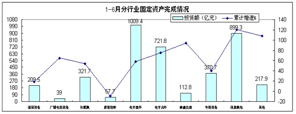 上半年,電子元件、器件和信息機電行業分別完成投資722、1009和899億元,三個領域投資占全行業的66%,同比分別增長75.3%、57.7%和120.3%,其中光電器件和新能源電池是投資最多、增勢最突出的領域,投資達到639和728億元,增長100%和128%。