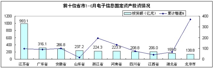 上半年,電子信息產業500萬元以上項目完成投資3960億元,規模接近去年前三季度水平,同比增長67.6%,高于去年同期26.6個百分點,高于同期工業投資40.7個百分點。自二季度起,投資增速高位回落,6月份增速(37.5%)比4、5月份分別回落52和31.4個百分點。
