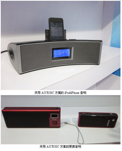 AU7850C集成了豐富的外設和接口,包括藍牙、iPod/iPhone docking接口、數字音頻廣播接口,方便用戶進行個性化設計;支持溫度、頻譜、電池電量顯示,中文歌詞同步顯示;集成16位DAC以保證高品質音頻輸出。芯片集成度高、待機功耗低、系統設計簡單,BOM成本低。