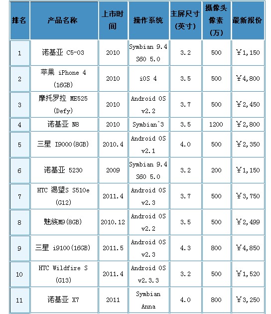- 諾基亞C5-03領銜,蘋果、摩托羅拉產品緊跟
