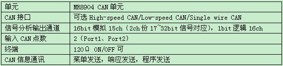 使用MR8904單元,可測量CAN格式數(shù)據(jù),在汽車研發(fā)現(xiàn)場非常實用。(所謂CAN,即“Controller Area Network”,是獲取汽車引擎轉數(shù)、輪胎壓等數(shù)據(jù)的方式。)