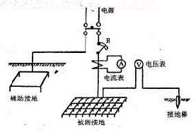 最初人們對接地電阻的測量是用伏、安法,這種試驗是非常原始的。圖1是用安培計、伏特計的測量方法。在測定電阻時須先估計電流的大小,選出適當(dāng)截面的絕緣導(dǎo)線,在預(yù)備試驗時可利用可變電阻R調(diào)整電流,當(dāng)正式測定時,則將可變電阻短路,由安培計和伏特計所得的數(shù)值可以算出接地電阻。