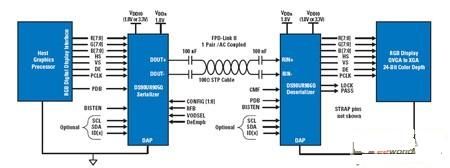 一旦接收器PLL鎖定在發射器的頻率下,即可由LOCK輸出標志引腳顯示這一狀態,確保接收器輸出的數據完整性。DS90UR907/8芯片組具有DS90UR905/6芯片組的一切特性,兩耳區別在于輸入輸出不再是發送LVCMOS信號的并行總線,而是遵照開放的工業標準"FPD-Link"。很多現代化的圖像控制器、顯示定時控制器、ASIC和FPGA都支持這種"一級串行化"技術,它采用適合18bpp的3個數據通道,或者適合24bpp的4個數據通道,每一個都有一路并行時鐘通道。電信號的發送遵循開放的ANSI/TIA/EIA-644A標準,該標準又稱作"LVDS"(低壓差分信號傳輸)。使用該接口技術代替常規LVCMOS的優勢在于:采用差分信號可降低電磁干擾,并減少組件的引腳數量,如圖3所示。