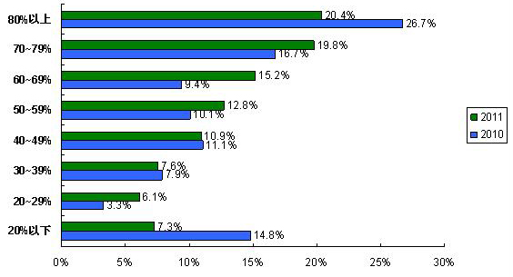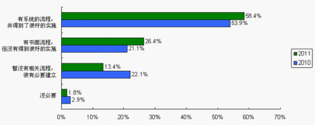 供求雙方把伙伴關系建立在專業評估的基礎上,通過系統流程可以有效減少供應商認證和引入過程中的不合理操作、暗箱操作、防范采購風險、提高采購效率。在供應商認證與引入過程中,沒有建立和認為沒必要建立系統流程的受訪者比例由2010調查的25%(22.1%+2.9%)降至2011調查的15.2%(13.4%+1.8%),已經建立流程并且得到很好實施的比例也由2010調查的53.9%上升至2011調查的58.4%。