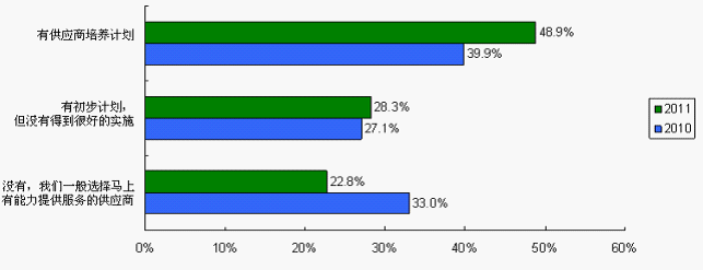 培養供應商有利于建立供求雙方的伙伴關系,提高供應商忠誠度,增強采購風險抵御能力。有供應商培養計劃的系統廠商由2010調查的39.9%上升至2011調查的48.9%,而沒有計劃的由2010調查的33%降至22.8%。