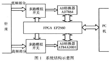 本自動測試系統(tǒng)的結(jié)構(gòu)框圖見圖1。系統(tǒng)的工作原理是:通過針床將待測信號導(dǎo)出,F(xiàn)PGA 通過控制多路模擬開關(guān)將待測信號采集進(jìn)來,將數(shù)據(jù)通過相應(yīng)協(xié)議傳送到PC 機(jī),用自動測試軟件測試各個(gè)信號是否正常。