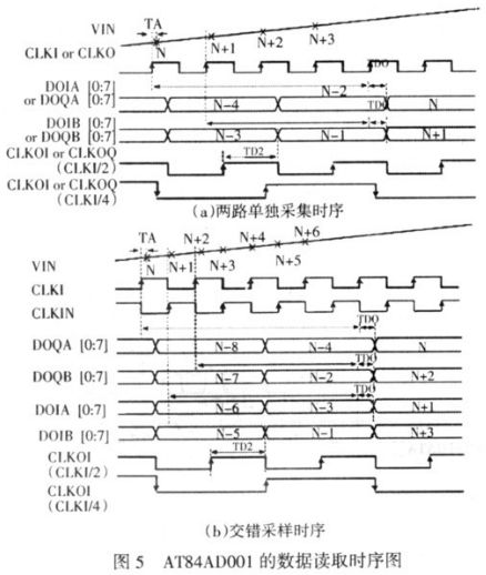 AT84AD331 可以配置成I 路和Q 路單獨(dú)使用,此時(shí)可以同時(shí)采集兩路信號,最高采樣率為1 Gs/s;也可以配置成I 和Q 路的交錯(cuò)采樣,此時(shí)只能采集1 路信號,等效采樣率為2 Gs/s,使用時(shí)可以根據(jù)需要對該芯片進(jìn)行在線配置。FPGA 對AT84AD331數(shù)據(jù)讀取時(shí)序見圖5。