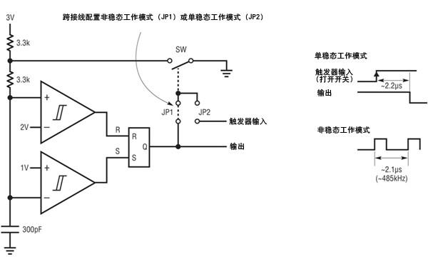 增加若干組件以后,具有可預測的充電和放電特性的 RC 電路就可用作電子定時組件了。RC 電路的一個良好特性是,可用來設定具有單穩態和非穩態響應的時序,如圖 2 所示。在單穩態工作模式時,觸發器打開開關,電容器充電,當電容器達到 2V 時,比較器使輸出復位。要實現啟動、停止排序或延遲一個事件等異步時序時,單穩態工作是必需的。在非穩態工作模式,反饋信號不斷改變電容器的充電和放電方向,保持電容器電壓在一個固定范圍內 (本例為 1V 到 2V 之間)。結果,只要保持對電路的供電,就能產生連續的脈沖串,或者形成振蕩器。