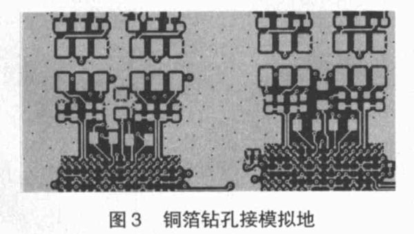 (5 )大面積覆銅箔接模擬地。在模擬電路部分覆大面積銅箔并在空白區域鉆密集的孔接到模擬地,這樣可以起到屏蔽隔離作用,從而減少模擬信號之間的相互干擾,而且還可以起到散熱作用。