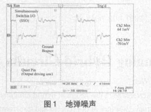 模擬信號與數字信號相比,對噪聲的敏感程度要大得多,因為模擬電路的工作依賴連續變化的電流和電壓,任何微小的干擾都能影響它的正常工作,而數字電路的工作依賴在接收端根據預先定義的電壓電平或門限對高電平或低電平的檢測,具有一定的抗干擾能力。但在混合信號環境中,數字信號相對模擬信號而言是一種噪聲源。數字電路工作時,穩定的有效電壓只有高低電平兩種電壓。當數字邏輯輸出由高電壓變為低電壓,該器件的接地管腳就會放電,產生開關電流,這就是電路的開關動作。數字電路的速度越快,其開關時間一般也要求越短,當大量的開關電路同時由邏輯高電平變為邏輯低電平時,由于地線通過電流的能力不夠,大量的開關電流就會引起邏輯地電壓發生波動,我們稱為地彈。如圖1 所示。數字電路造成的地彈噪聲和電源擾動,如果耦合到模擬電路中,就會影響模擬電路的工作性能。由于相當多的干擾源是通過電源和地總線產生的,其中地線引起的噪聲干擾最大,所以在PCB 設計時對地和電源的設計就顯得尤為重要。