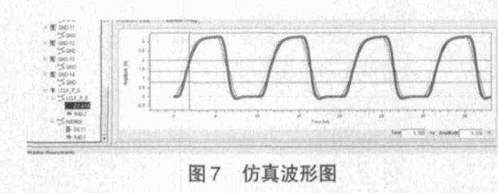 此印制板上100M 的時鐘信號線經過設計軟件仿真分析,如圖7 所示,信號傳輸基本沒有受到干擾,達到電訊要求。生產的印制板經過調試顯示,數字信號對模擬信號的干擾很小,參數指標良好。