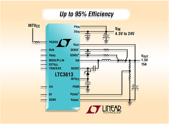 LTC3613 的差分放大器提供正和負端的真正遠端輸出電壓采樣,從而實現了高準確度調節,并不受走線、通孔和互連線中 IR 損耗 (高達 ±500mV) 的影響。很短的 65ns 最短接通時間在高頻工作時允許使用高降壓比電源。工作頻率在 200kHz 至 1MHz 范圍內是可選的,并可同步至一個外部時鐘。輸出電流通過檢測輸出電感器的 DCR 兩端壓降來監視,旨在實現最高效率,或通過使用一個采樣電阻器來監視。其他特點包括內置偏置電壓 LDO、軟啟動或跟蹤、過壓保護、限流折返和外部 VCC 控制。