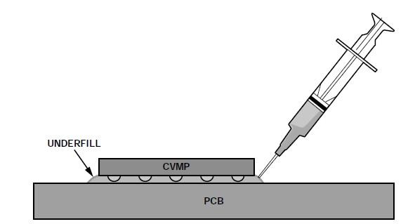 焊接完成后,由于焊料厚度有限,封裝與PCB之間會(huì)有一個(gè)較窄的空間。已經(jīng)證明,用底部填充材料填充此空間可以改善焊接抗疲勞壽命,因?yàn)樗軠p輕這種封裝(引腳為嵌入式,不能用來釋放應(yīng)力)中焊點(diǎn)應(yīng)力的影響。