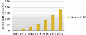 雖然最近兩年由于超薄筆電高售價與超薄顯示器供應(yīng)限制等因素,市場將無法快速增長;但是未來作為新型計算機(jī)產(chǎn)品,超薄筆電更時尚的設(shè)計、實時啟動和電池待機(jī)時間長等特性,有望于在預(yù)測后期拉動市場需求。到2017年,筆記型計算機(jī)預(yù)計將出貨4億3千2百萬臺。