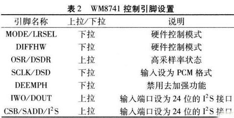 WM874l的I2S輸入接口與CS8416的輸出連接時(shí)中間加入100Ω電阻進(jìn)行緩沖,如圖2所示。WM874l設(shè)定硬件控制模式,即通過(guò)特定引腳的上拉或下拉狀態(tài)決定其工作狀態(tài),且所有上拉或下拉的電阻均為10kΩ。該系統(tǒng)設(shè)計(jì)的WM8741控制引腳設(shè)置如表2所示。
