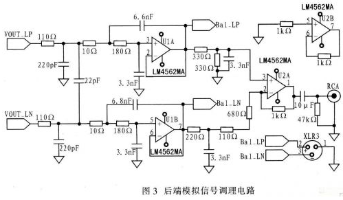 WM8741輸出的模擬信號(hào)中夾雜高次諧波分量,因此需經(jīng)低通濾波濾除高頻噪聲,進(jìn)而得到較為純凈的模擬信號(hào)。濾波電路采用LM4562型運(yùn)算放大器。對(duì)于數(shù)模轉(zhuǎn)換電路,在D/A轉(zhuǎn)換器的后面需采用3階濾波器才能達(dá)到防混疊要求。由LM4562外加電阻電容組成的三階巴特沃斯低通濾波器,如圖3所示。濾波器是單位增益,通頻帶內(nèi)平坦度好。經(jīng)濾波后的信號(hào)可直接作為解碼器的平衡信號(hào)輸出。當(dāng)以RCA接口輸出時(shí),還需把差分信號(hào)轉(zhuǎn)換為單端信號(hào),該轉(zhuǎn)換電路是由一片LM4562組成的差動(dòng)放大電路。單端信號(hào)經(jīng)一只10μF的隔直電容輸出到RCA接口。LM4562采用單獨(dú)的±12V電源供電。