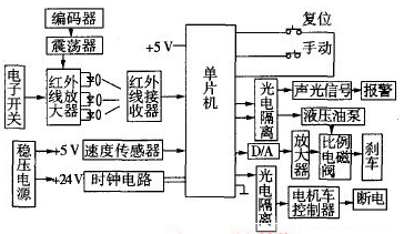 紅外線發(fā)射單元包括編碼調(diào)制器、載波振蕩器、電子開關(guān)、發(fā)射管、聚光透鏡等組成;紅外接收單元為紅外集成一體化接收頭;主控制單元由單片機、時鐘電路、復(fù)位電路、手動操作鍵盤、D/A轉(zhuǎn)換器組成;執(zhí)行單元由光電隔離器、模擬放大器組成;聲光報警單元由電機車電笛和閃光報警電路構(gòu)成;液壓制動單元由速度傳感器、液壓油泵、比例電磁閥、溢流閥、液壓油缸、剎車推桿等組成。