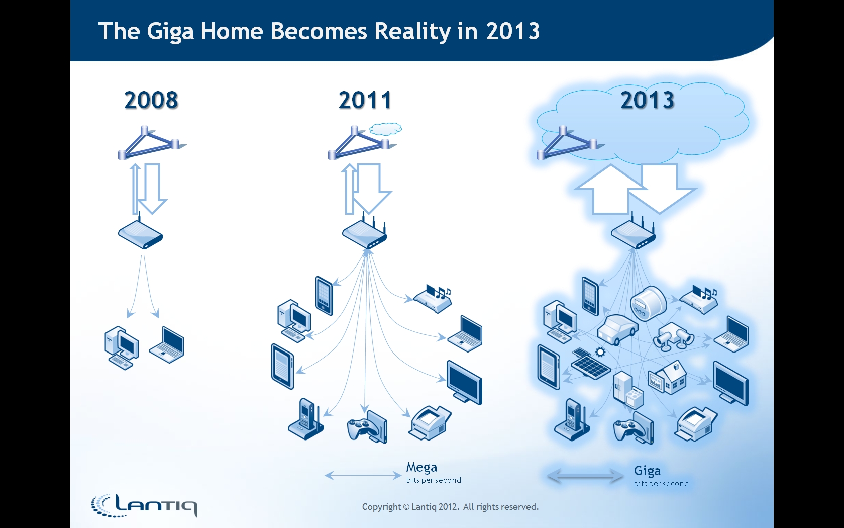 在家庭之中,對帶寬的需求持續不斷地增長。平板電腦、智能手機、PC、網絡存儲設備(NAS)、電視和游戲機都需要可靠且快速的高數據流量。所有的這些設備都相互連接并聯到互聯網中,當添加了云計算和HDTV/IPTV流媒體服務時,寬帶網絡中的數據需求將爆發。