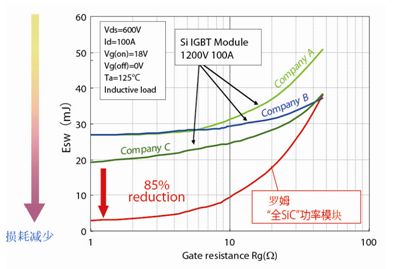 內置了最先進的SiC-SBD與SiC-MOSFET的“全SiC”模塊,與傳統的Si-IGBT相比,開關損耗可降低85%。