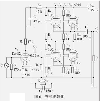 輸出級采用SRPP電路,電子管既可選擇內阻合適的三極管,如6N6,E182CC,也可選擇用于功放的小功率五極管,如6P15,6P14,EL42,EL91,EL84,EL86。