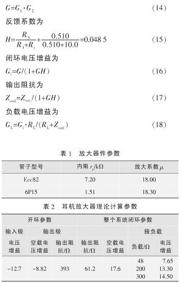 輸入級放大器件選用Ecc82雙三極管,輸出級選用6P15,基本參數如表1所示。為降低輸出阻抗,以便于和阻抗較低的耳機相匹配,輸出級SRPP電路采用雙管并聯的方式工作。放大器的相關參數計算方法如下所示,其中開環電壓增益為: