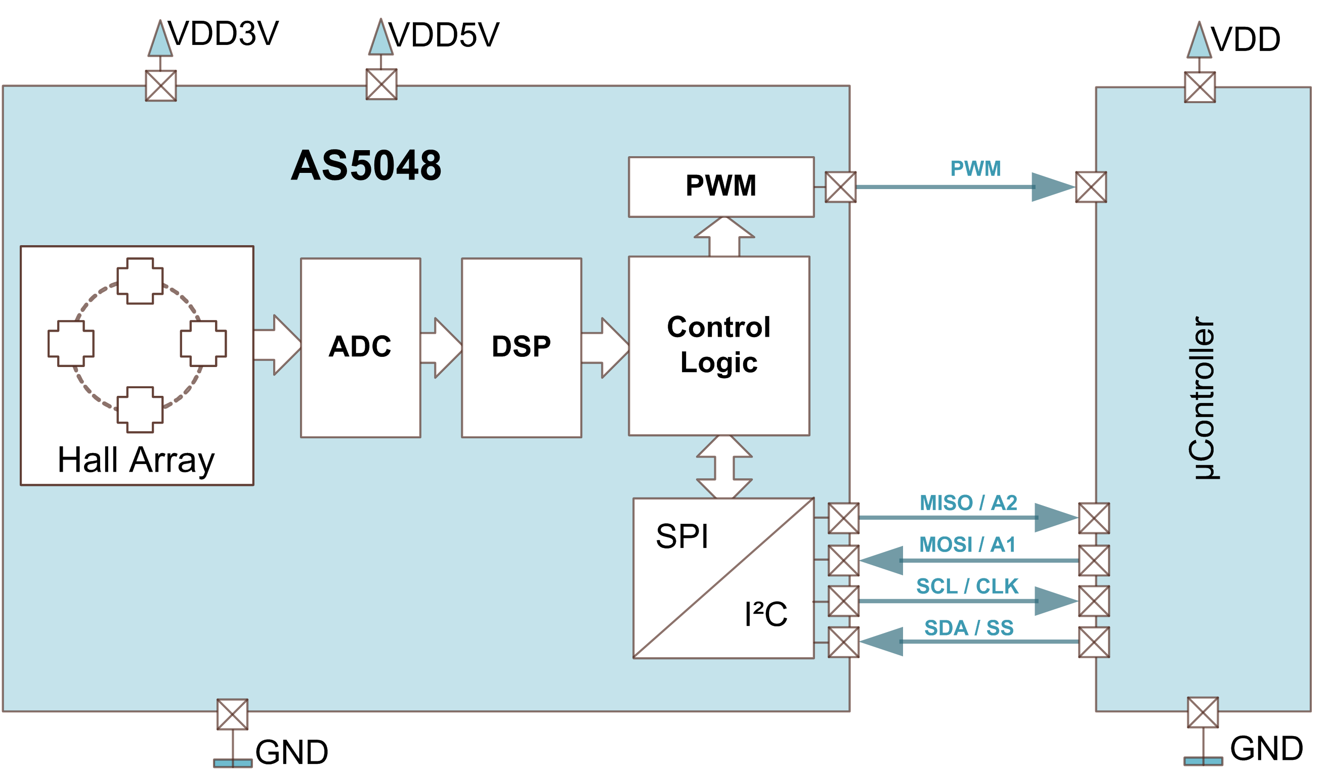 AS5048提供PWM輸出以及SPI或I2C接口,為微控制器提供絕對(duì)角度測(cè)量。在進(jìn)行機(jī)械設(shè)計(jì)時(shí)無(wú)須考慮芯片初始零位和它 所使用磁鐵磁極的精確配對(duì),取而代之的方案是:零位早在組裝時(shí)通過(guò)簡(jiǎn)單的SPI或I2C命令(無(wú)需特殊的編程設(shè)備)即可編程進(jìn)AS5048內(nèi)部的存儲(chǔ)器。