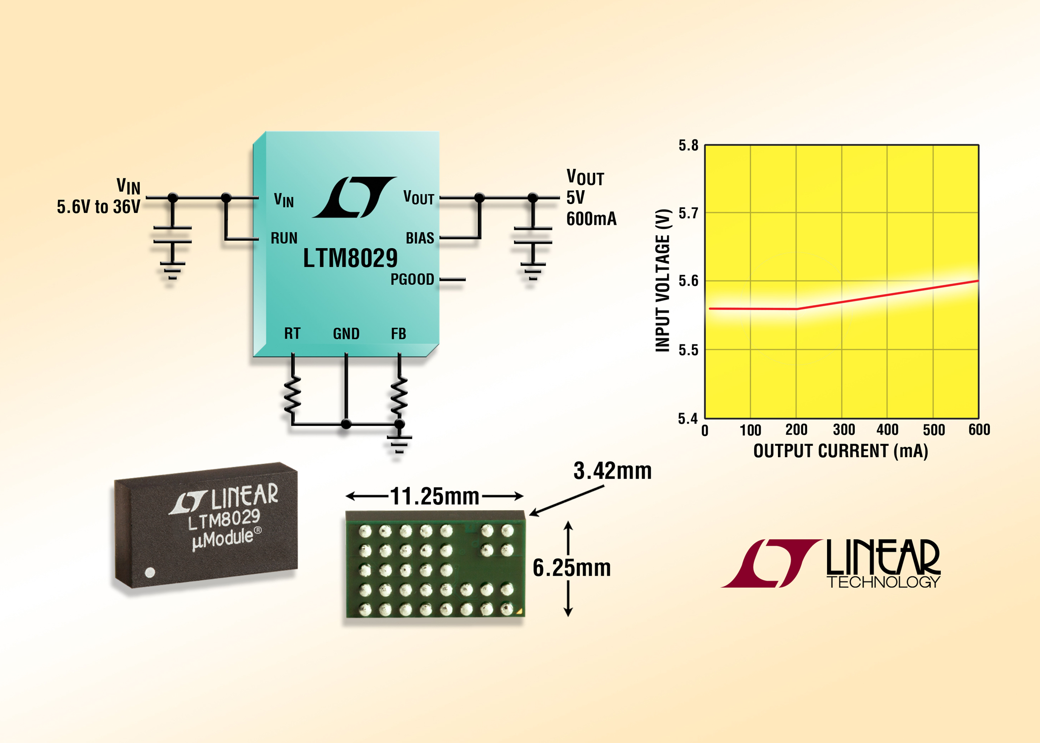LTM8029 在小型 6.25mm x 11.25mm x 3.42mm BGA 封裝中含有電感器、電源開關、DC/DC 控制器和其他電路。從 5VIN、12VIN 和 24VIN 至 3.3VOUT/600mA 工作時,效率分別為 84%、79% 和 75%。當以 600mA 滿電流從 36VIN 轉換到 3.3VOUT 時,節溫上升最小,僅為 17°C。LTM8029 具 200kHz 至 2.2MHz 的可調開關頻率,對必須保持開關噪聲在一定限度之內的應用是非常有用。除了正至正轉換,LTM8029 還可用來調節負輸出電壓。千片批購價為每片 6.60 美元。