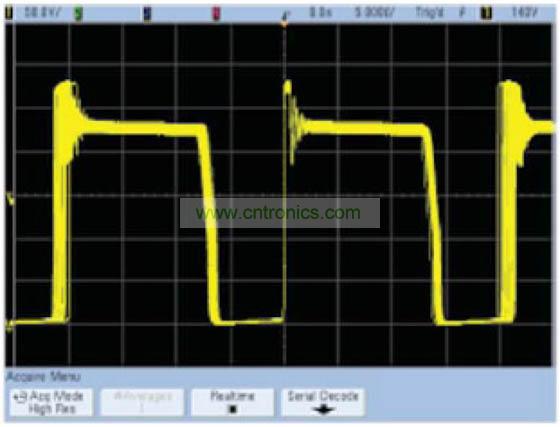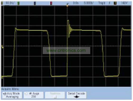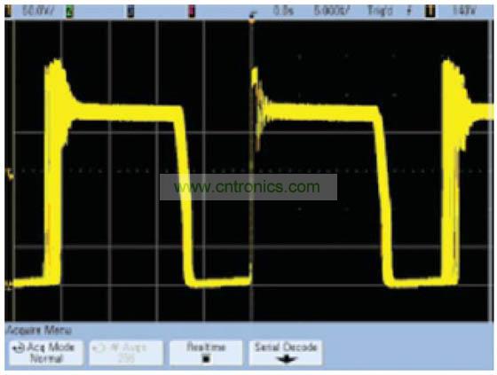 這種算法在垂直分辨率為12位時效果最好,因為再繼續增加下去,其他因數(例如示波器的垂直增益或偏置精度)將起到決定性作用。平均模式的優點是,它對示波器的實時帶寬沒有任何限制。缺點是它要求使用重復性信號,并會降低波形更新速率。在正常采集模式下與平均模式下捕獲的開關電源的Vds分別如圖1和圖2所示。