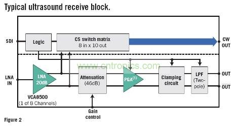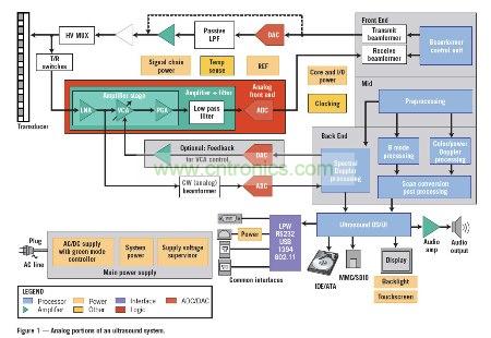 首先以超聲波設(shè)備為例來探討模擬性能需求。通過該范例,本文將介紹如何在性能、功耗、尺寸以及集成度之間進行權(quán)衡,并檢測雙極性與CMOS工藝技術(shù)的適用性。圖1是典型超聲波機器的系統(tǒng)方框圖,展示了傳輸與接收兩個部分。這兩個部分負責驅(qū)動傳感器與數(shù)字處理部分(未顯示),從而構(gòu)成完整的超聲波設(shè)備。