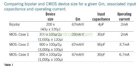 表1:雙極性器件和COMS器件的尺寸比較