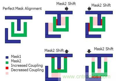 圖2:雙重成像(DP)的光罩可能存在的未對準(zhǔn)情況要求設(shè)計(jì)人員評估更多寄生參數(shù)提取的corners,以驗(yàn)證集成電路的時(shí)間選擇和性能。