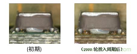 磁性樹脂和鼓芯都沒有看見裂紋產生。另外,電氣特征的變化也控制在±1%以內。-40℃⇔+105℃的環境下外觀上沒有任何的破壞,并且電氣特征保持穩定,這使其成為了能夠滿足車載用電子元器件性能要求的產品。