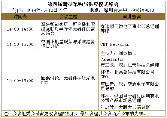 此次峰會(huì)旨在幫助供需雙方的經(jīng)理人了解熱點(diǎn)市場(chǎng)帶來(lái)的對(duì)半導(dǎo)體元器件的需求變化,中國(guó)小批量供應(yīng)服務(wù)與采購(gòu)趨勢(shì)。圓桌討論將針對(duì)采購(gòu)和供應(yīng)中的熱點(diǎn)話(huà)題,中國(guó)電子分銷(xiāo)商聯(lián)盟秘書(shū)長(zhǎng)劉杰博士與行業(yè)領(lǐng)先的國(guó)內(nèi)和國(guó)際分銷(xiāo)商總裁和總監(jiān)們逐一分享思路,歡迎參與互動(dòng)。參會(huì)可以通過(guò)網(wǎng)上或微信(關(guān)注我愛(ài)方案網(wǎng)),報(bào)名注冊(cè):