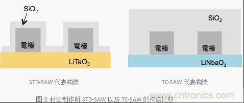圖3是村田制作所STD-SAW以及TC-SAW構(gòu)造的示意圖。SAW雙工器的頻率溫度依賴性是由于使用了壓電電路板造成的。此外,STD-SAW、TC-SAW都是因?yàn)槭褂玫膲弘婋娐钒寰哂蓄l率溫度依賴性的相同特點(diǎn)。如圖3所示,TC-SAW最具代表性的特征之一是整塊電路板跟STD-SAW相比它的表面覆蓋了一層很厚的二氧化硅(SiO2)。壓電電路板的溫度上升的話頻率就會降低,那么頻率溫度系數(shù)就會變成負(fù)值。另外,SiO2具備正頻率溫度系數(shù)的特點(diǎn)。因此,和STD-SAW相比的話由于覆蓋了一層厚SiO2的獨(dú)特構(gòu)造,SiO2的正頻率溫度系數(shù)的影響會變大,那么SAW雙工器與STD-SAW相比就實(shí)現(xiàn)了抑制頻率溫度依賴性的特點(diǎn)。STD-SAW的保護(hù)膜SiO2具有強(qiáng)大的特質(zhì),如果覆蓋了像TC-SAW一樣厚的SiO2的話就不能保證帶寬,同時(shí)也不能獲得優(yōu)良的特性。因此,TC-SAW將電路板的材料從LiTaO3變成了LiNbaO3,才能夠確保必要的帶寬。此外,TC-SAW的LiNbaO3的切割角發(fā)生了變化使得頻率選擇性變得可控制,村田制作所運(yùn)用了對應(yīng)項(xiàng)目的必要特性設(shè)計(jì)了符合市場需求的最佳切割角。