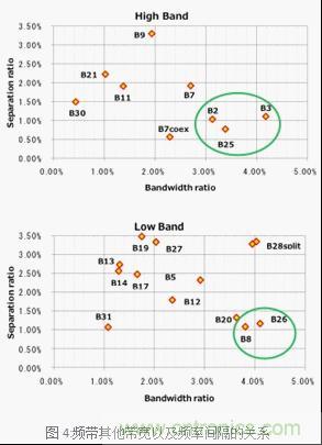 雙工器的設(shè)計(jì)根據(jù)Third Generation Partnership Project (3GPP)的規(guī)格根據(jù)頻帶的送信和收信帶寬以及送信端和收信端的頻率間隔(Separation ratio)決定了其難易度。一般來說頻率的帶寬越廣那么送信端和收信端的頻率間隔越小難易度就越高。總結(jié)兩者的關(guān)系來看,如圖4。村田制作所正致力于圖4中圈出的部分,計(jì)劃優(yōu)先實(shí)現(xiàn)TC-SAW對應(yīng)的產(chǎn)品。